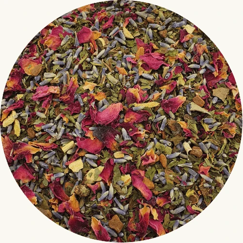 Kaneel Cassiae, Lavendel, Spearmint, Rozenblaadjes en Zoethout.