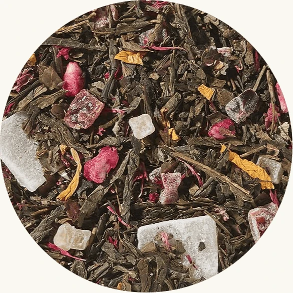 Groene thee (54%), dadelstukjes (dadels, rijstbloem), ananasblokjes (ananas, suiker), gekonfijte Aloë Vera (Aloë Vera, suiker), natuurlijke Aroma, zoete braambesbladeren, gedroogde. Granaatappel kernen, korenbloemblaadjes, zonnebloemen