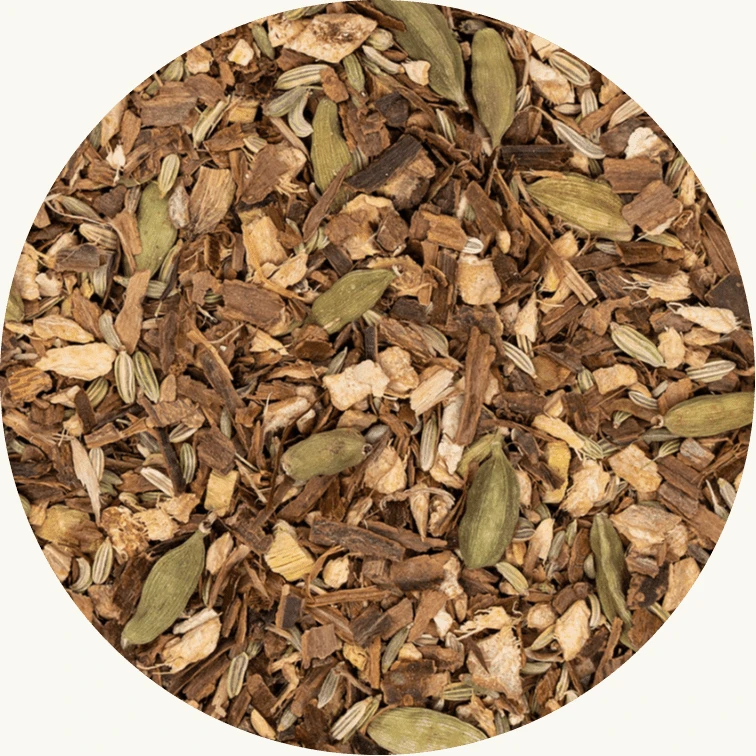 kaneelstukjes*, gemberstukjes*, venkel*, kardemom (heel)*, zoethoutwortel*, citroenschil*.