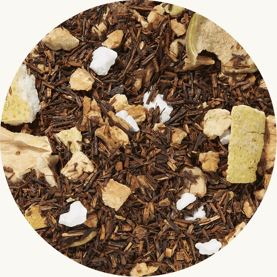 Rooibosthee, appelstukjes, appelschijfjes, aroma, citroenschil, gevriesdroogde citroengranulaat (maltodextrine, vrucht (citroensap), natuurlijke citroenolie, geleermiddel: natriumalginaat), gevriesdroogde citroenschil.